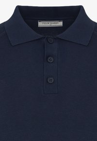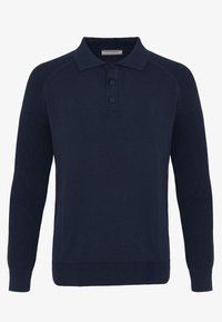 Hombre de pie con las manos en los bolsillos, vistiendo un polo de manga larga azul marino, pantalones grises con cinturón marrón y zapatos de cuero marrón sobre un fondo liso.