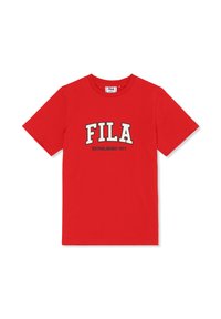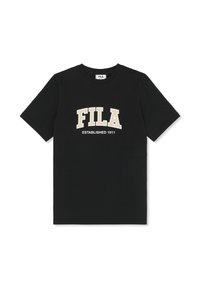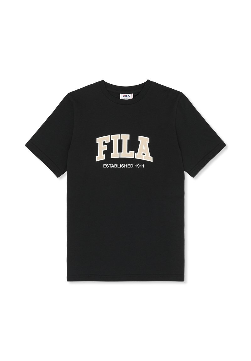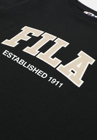 Camiseta negra de manga corta con cuello redondo y el texto destacado "FILA" en beige y "ESTABLISHED 1911" en blanco en la parte frontal.