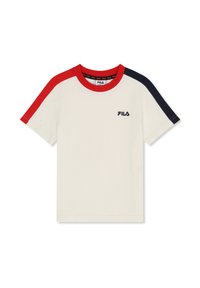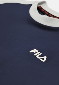 Camiseta azul marino FILA con cuello blanco, franja blanca en la manga izquierda y franja roja en la manga derecha, logo de FILA en el pecho.