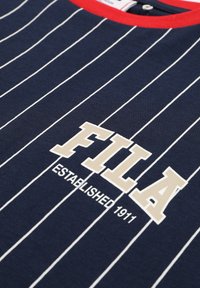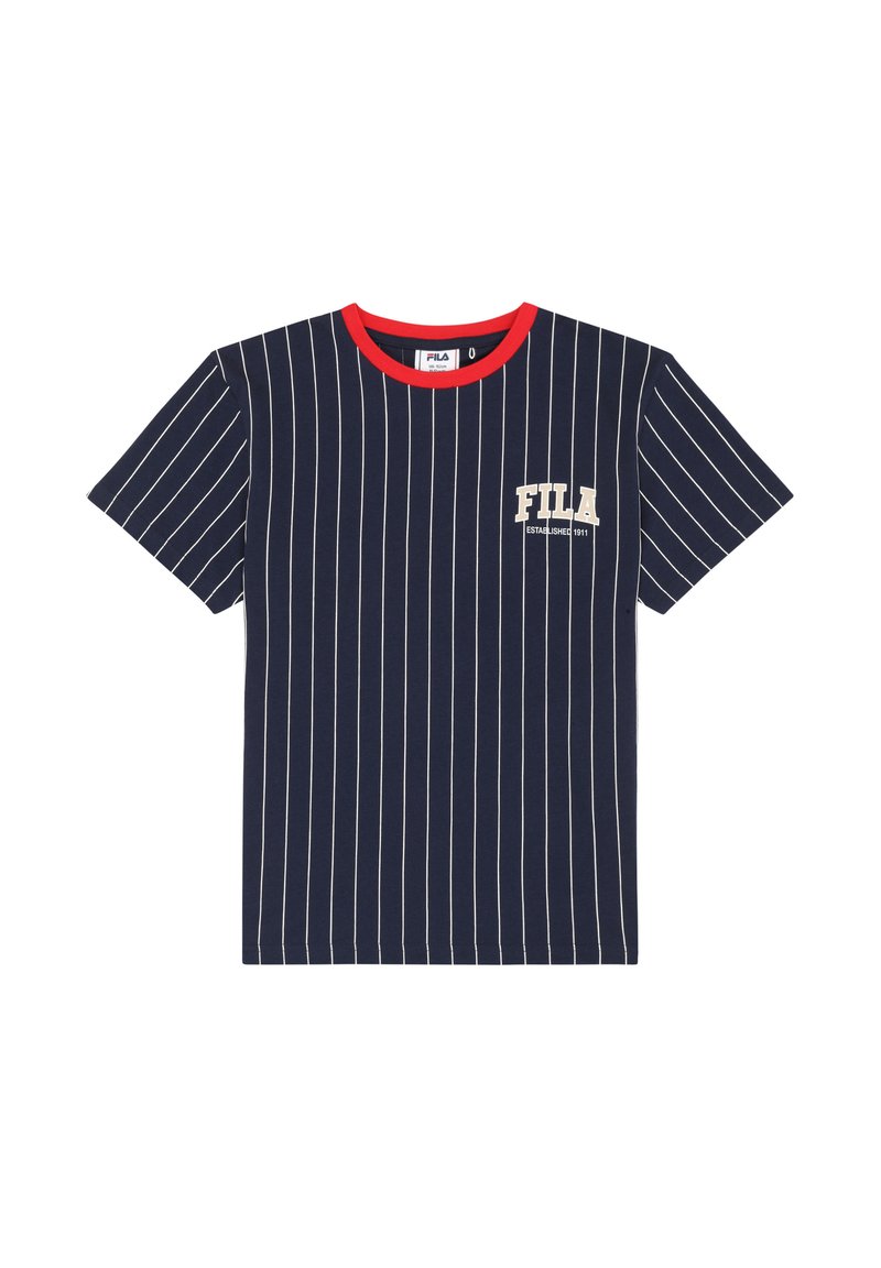 Camiseta de manga corta azul marino con rayas verticales blancas, cuello rojo y logo blanco de FILA en el pecho izquierdo.