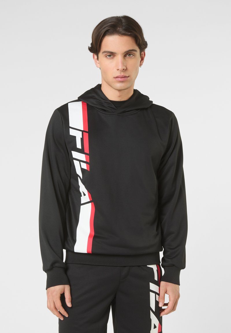 Joven con cabello corto y oscuro que lleva una sudadera con capucha negra de FILA y pantalones a juego con franjas verticales de logotipo en rojo y blanco.