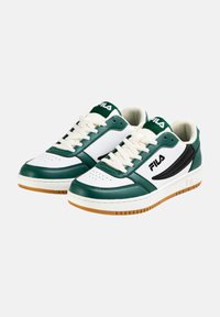 Zapatilla FILA de corte bajo con paneles de cuero blancos, verdes y negros, cordones blancos y suela de goma color caramelo.