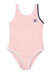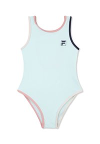 Traje de baño de una pieza sin mangas de color azul claro con ribetes en rosa, beige y azul marino oscuro, y un pequeño logo de FILA en el pecho.