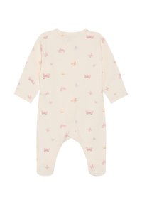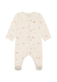 Body para bebé de color crema con mangas largas, estampado de mariposas, cremallera frontal con volante decorativo y piernas con cubre pies.