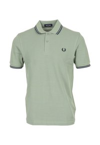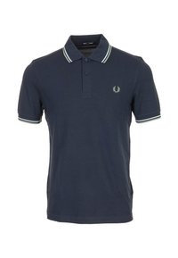 Polo de color azul claro con una tapeta de dos botones, cuello y puños de las mangas a rayas en blanco y negro, y con un pequeño logo en el lado izquierdo del pecho.