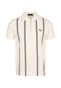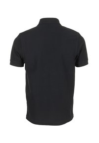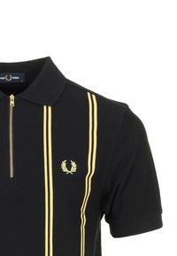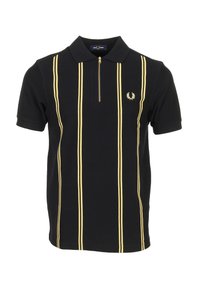 Polo de manga corta negro con rayas verticales amarillas, cremallera frontal hasta la mitad y logotipo de laurel bordado en el pecho izquierdo.