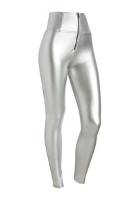 Leggings dorados metálicos de cintura alta con cremallera frontal, textura suave y diseño ajustado. Aptos para diversas opciones de estilo.