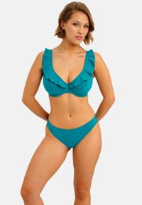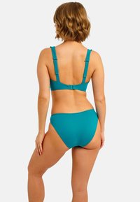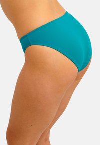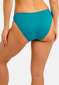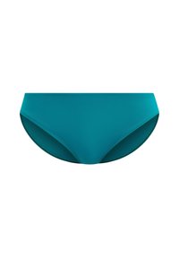 Braguita de bikini azul verdoso con diseño de tiro bajo, textura suave y cobertura mínima. Corte sencillo sin accesorios ni estampados adicionales.