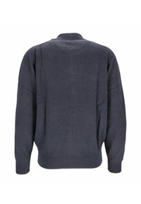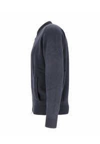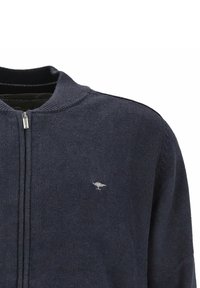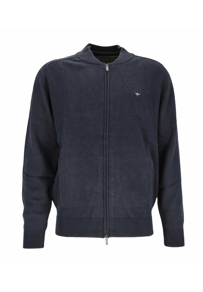 Suéter azul marino con cremallera, puños y dobladillo acanalados, pequeño logo bordado en el pecho y cuello redondo.