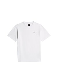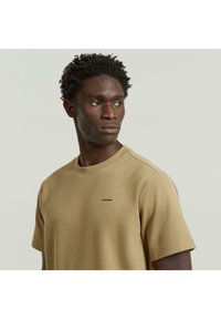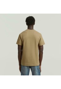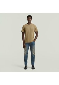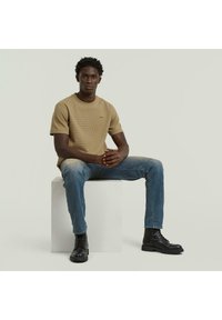 Joven de pie, vistiendo una camisa beige de manga corta con textura y jeans azules desgastados, contra un fondo claro y sencillo.