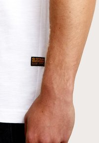 Camiseta blanca de algodón con texto frontal: "AMSTERDAM G-STAR PURVEYORS RAW DENIM 1989." Cuello redondo, manga corta, ajuste regular.