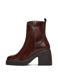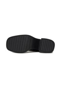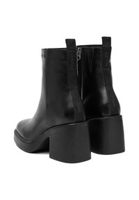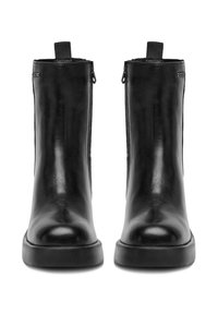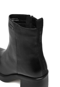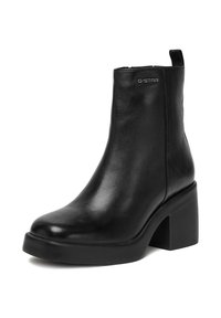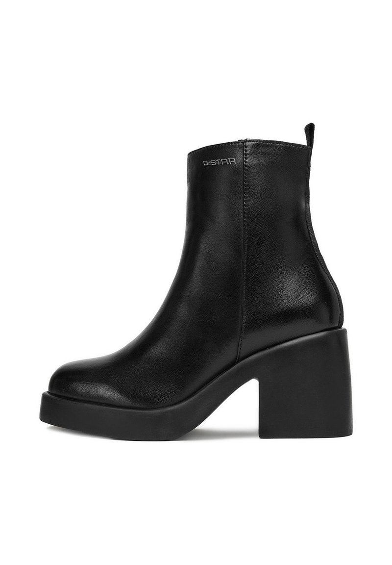 Botín de cuero negro hasta el tobillo con tacón ancho, punta redonda y logo de G-Star cerca de la parte superior sobre un fondo blanco.