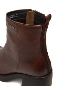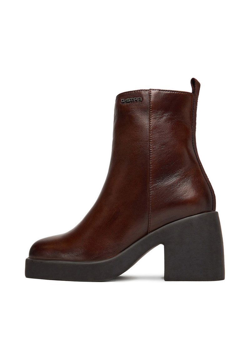 Botín de cuero marrón hasta el tobillo con tacón negro grueso, costuras laterales, lengüeta en la parte trasera y pequeño logo "G-STAR" en la parte exterior superior.