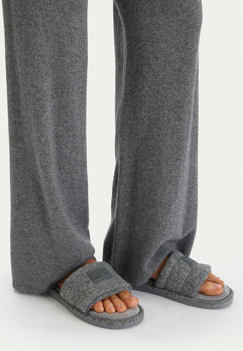 Pies con pantuflas de tela gris suave con correas acolchonadas, combinadas con pantalones sueltos grises sobre un fondo claro y liso.
