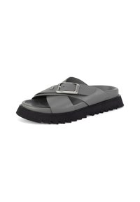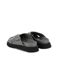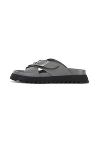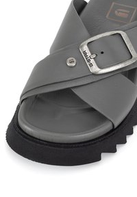 Sandalia deslizante sintética gris con una correa ancha y una hebilla de tono plateado. Cuenta con una suela negra gruesa con diseño en zigzag para mayor tracción.