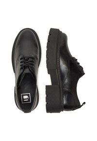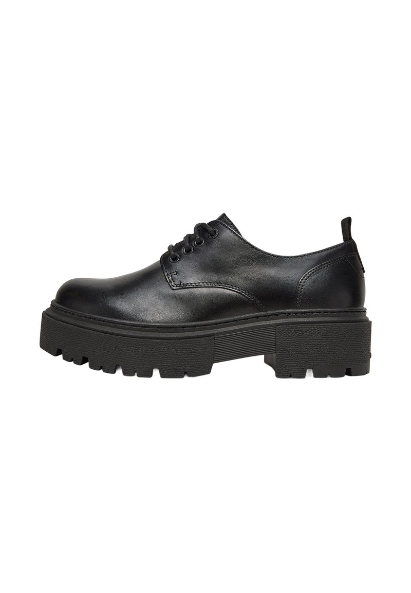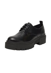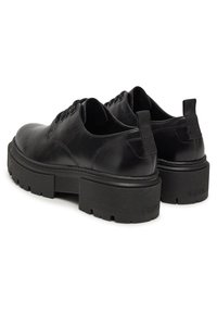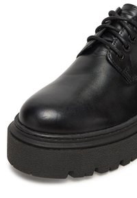 Zapatos negros de cuero con cordones, punta redondeada y suela gruesa de goma texturizada. Presentan costuras sutiles y una lengüeta para tirar en el talón.