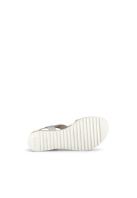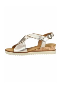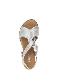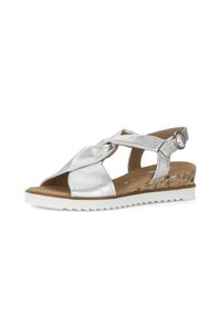 Sandalia de mujer de cuero plateado con tiras cruzadas, cuña de corcho, suela blanca con relieves y hebilla ajustable en el talón.