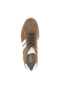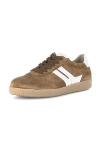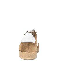 Zapatilla deportiva de ante marrón con detalles blancos en los lados, puntera redonda y suela de goma plana. Cuenta con cordones marrones y talón acolchado para mayor comodidad.