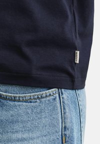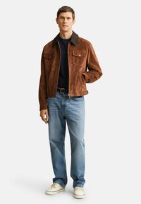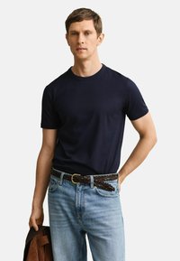 Hombre vistiendo una camiseta azul marino y jeans azul claro con un cinturón trenzado marrón, sosteniendo una chaqueta marrón en su mano izquierda.