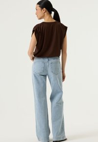 Camiseta marrón de cuello en V con mangas cortas, hecha de tela suave. Combinada con vaqueros azul claro, mostrando un ajuste relajado.