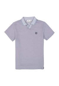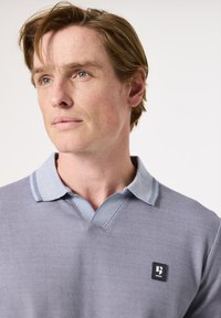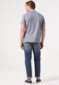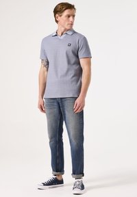 Camisa polo gris con un cuello en contraste, mangas cortas y un pequeño logotipo. Combinada con vaqueros azul claro y zapatillas de deporte navy.