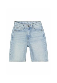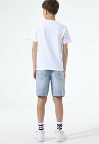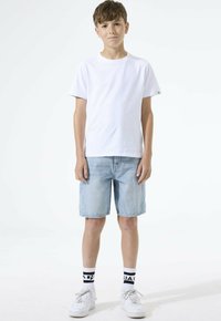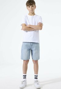 Niño con cabello corto y castaño, de pie con los brazos cruzados, vistiendo una camiseta blanca, pantalones cortos de mezclilla claros, calcetines blancos con texto negro y zapatillas blancas.
