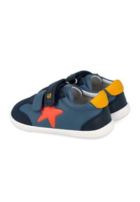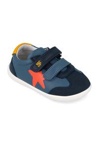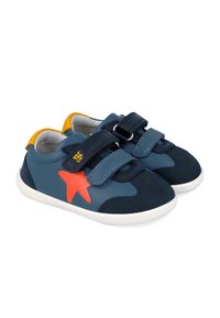 Zapatilla deportiva azul marino para niños con suela blanca, estrella naranja en el lateral, lengüeta amarilla en el talón y dos tiras de velcro.