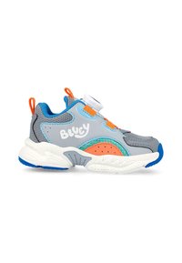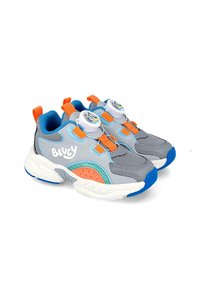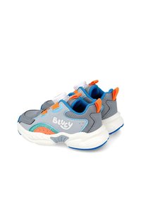 Zapatilla infantil en gris y azul con acentos naranjas, paneles de malla, suela blanca y el logo de "Bluey" en el lado.