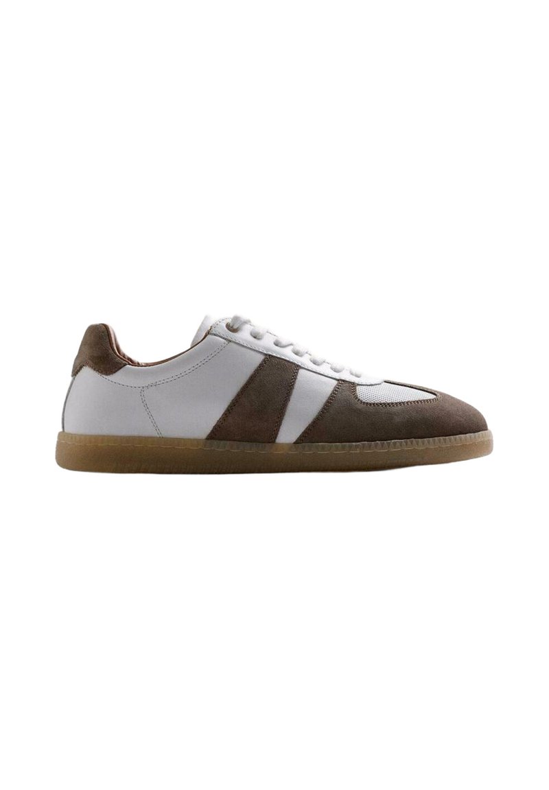 Zapatilla baja blanca con detalles en gamuza marrón y suela de goma color caramelo, vista de lado sobre un fondo blanco.