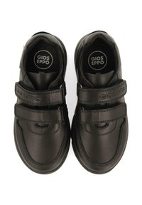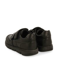 Zapatillas para niños negras con una parte superior de cuero liso, cierre de tiras de Velcro, cuello acolchado y suela de goma texturizada.