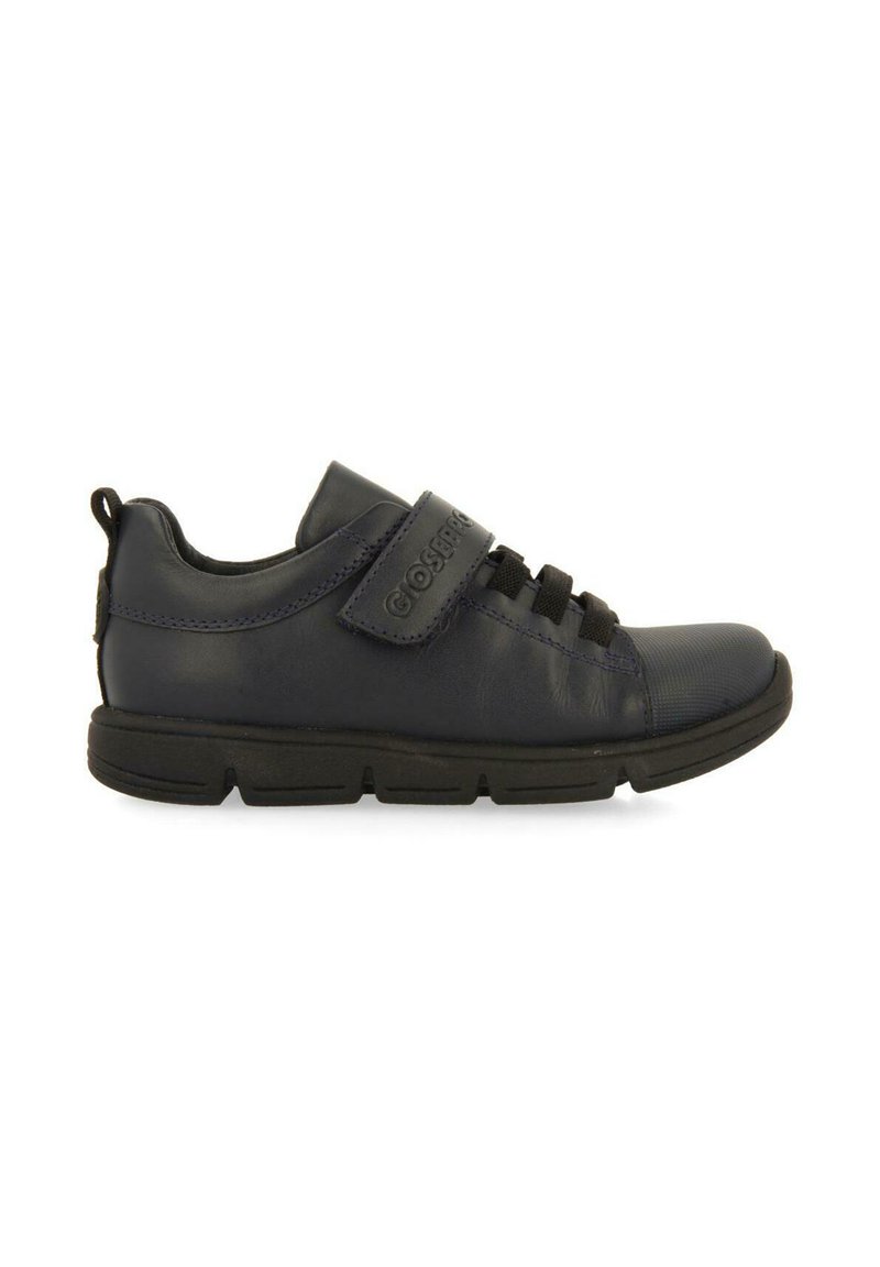 Zapatilla de cuero azul marino con acentos negros, que presenta una correa de Velcro, cordones elásticos y una suela texturizada. Vista lateral.