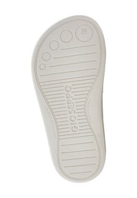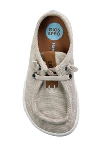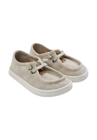 Zapatilla casual beige de lona con suela de goma blanca y pequeño detalle de cordones en el lateral, vista desde el lado exterior.