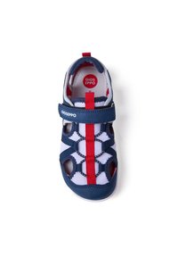 Sandalia deportiva azul y blanca con detalles rojos, parte superior de malla y sintética, correa ajustable y suela de goma texturizada con recortes.
