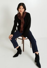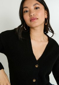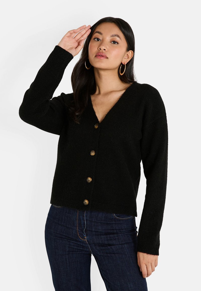Cárdigan de punto negro con escote en V, que presenta botones de bronce y mangas largas. La tela parece suave con un acabado ligeramente texturizado.