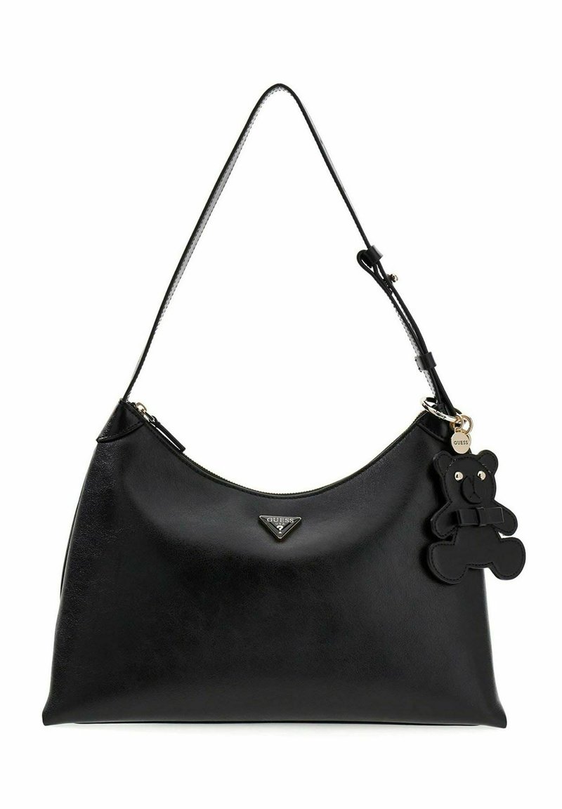 Bolso de hombro Guess de cuero negro con correa ajustable y llavero con oso de peluche negro adjunto.