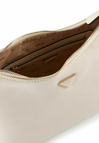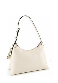 Bolso de cuero crema con correa negra, logo triangular de Guess y llavero adjunto de oso de peluche crema.