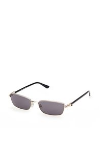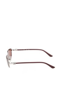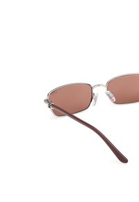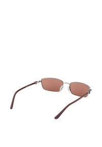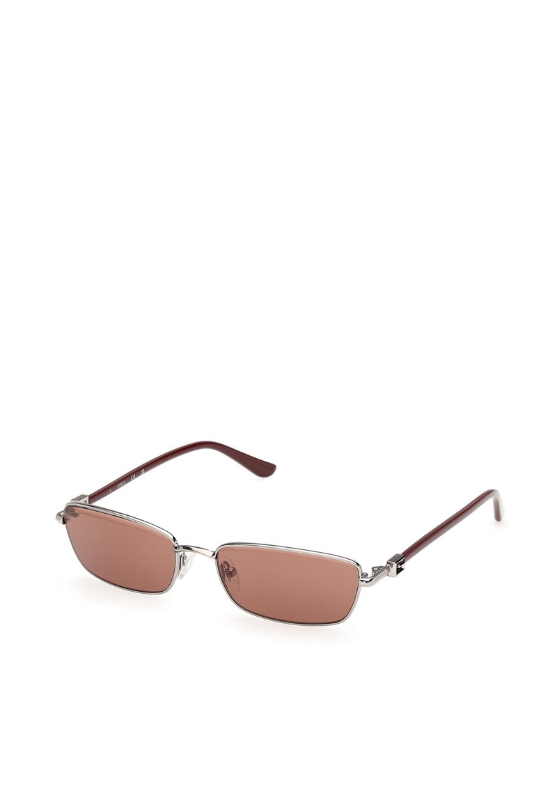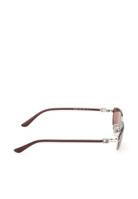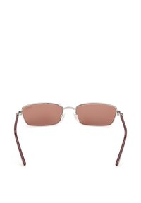 Gafas de sol rectangulares con montura de metal plateado y lentes tintados en marrón, que cuentan con varillas delgadas en marrón y almohadillas nasales ajustables.
