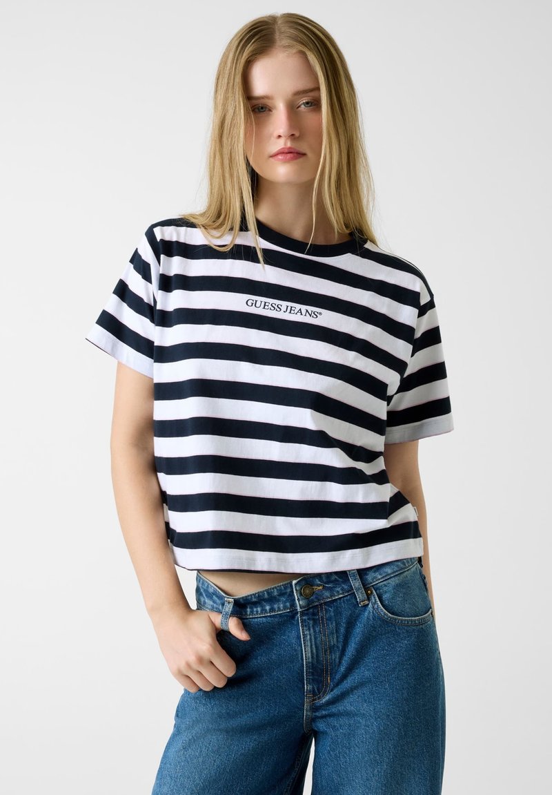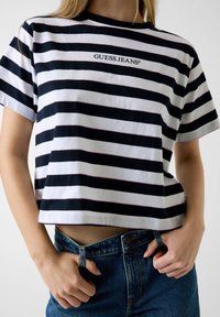 Camiseta corta de rayas blancas y negras con el logo "GUESS JEANS", hecha de algodón suave, combinada con vaqueros de mezclilla azul de talle alto.