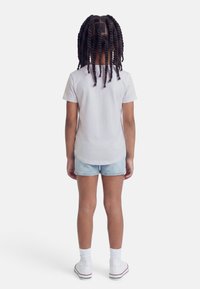 Niña joven con cabello trenzado, vistiendo una camiseta blanca con el logo azul de "GUESS", pantalones cortos de mezclilla claros, calcetas blancas y zapatillas blancas, de pie.