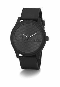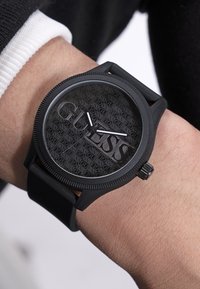 Reloj de pulsera con correa de silicona negra y esfera con el logo texturizado de Guess, llevado en la muñeca izquierda sobre ropa negra.