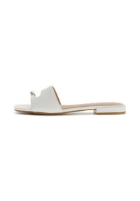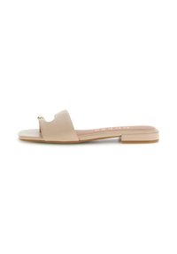 Sandalia negra sin cierre con lazo para el dedo y hebilla dorada, plantilla beige con la marca "GUESS", colocada sobre una alfombra frente a un mueble de color ámbar.