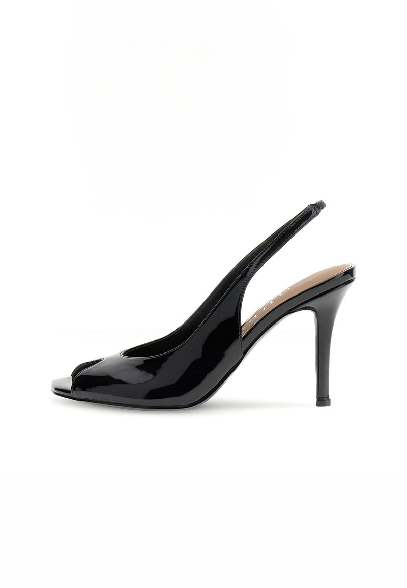 Zapato de tacón alto tipo slingback de charol negro con punta puntiaguda y tacón de aguja delgado sobre fondo blanco.