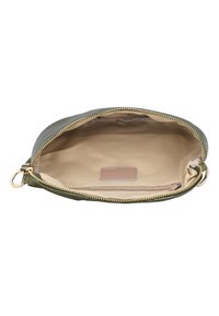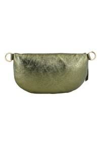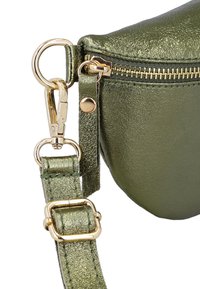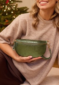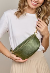 Mujer sonriente con cabello rubio ondulado, vistiendo camisa blanca y falda beige, sosteniendo un bolso cruzado de cuero metálico verde con cremallera dorada.