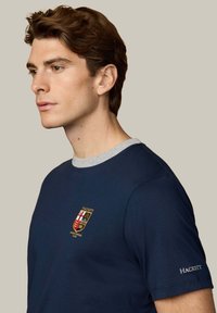 Joven con camiseta azul marino de cuello gris y un escudo en el pecho, combinada con pantalones blancos, posando frente a un fondo liso.
