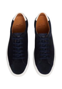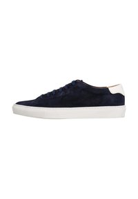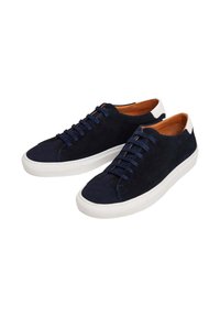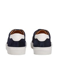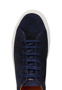 Zapatillas de ante azul marino con suela de goma blanca, puntera redonda y cordones azul oscuro. Presentan un diseño minimalista y una sutil marca en el talón.