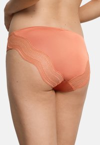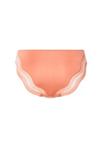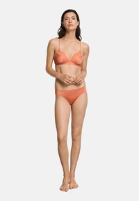 Mujer con braguita de bikini de un solo color coral, mostrando el torso y la parte superior de los muslos sobre un fondo blanco liso.