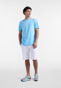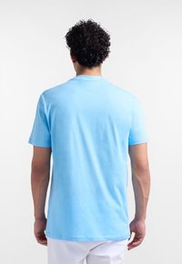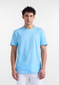 Camiseta de algodón azul claro con mangas cortas, cuello redondo y un diseño sutil impreso en el pecho en colores contrastantes.