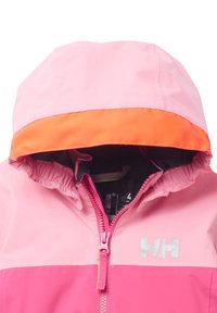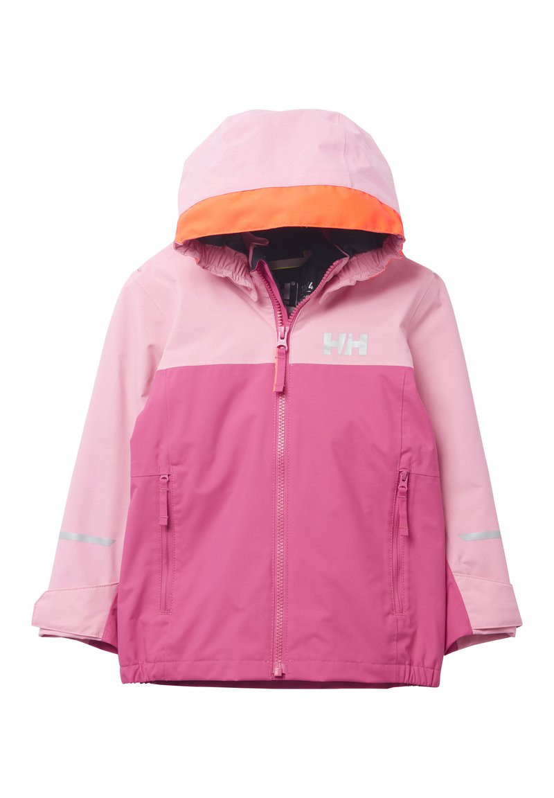 Chaqueta resistente al agua en rosa y rosa claro, con capucha con ribete naranja, cierre frontal de cremallera y detalles reflectantes en las mangas.