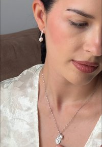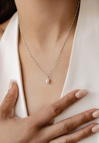 Eleva tu elegancia cotidiana con nuestro Collar Colgante de Perlas, una pieza atemporal que combina un diseño minimalista con la belleza natural. Este exquisito collar de plata de ley presenta una delicada cadena estilo Singapur, celebrada por su resistencia y tejido luminoso, centrada por un único colgante de perla de agua dulce. Cada perla es una obra de arte de la naturaleza, con una forma única y un suave brillo que habla de su origen auténtico. El collar se cierra de forma segura en la nuca con un broche de resorte redondo e incluye una pensada cadena de extensión de 5,0 cm —adornada con un sutil símbolo de concha grabado y un pequeño dije en forma de lágrima— para un ajuste perfecto y personalizable de hasta 46,0 cm. Ya sea combinado con otras cadenas o usado solo, su gracia discreta realza todo, desde tops casuales hasta ropa de noche.