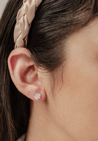Pendiente de plata redondo con un patrón geométrico, que se lleva en el lóbulo de la oreja. El cabello está peinado con una diadema trenzada de tono claro.